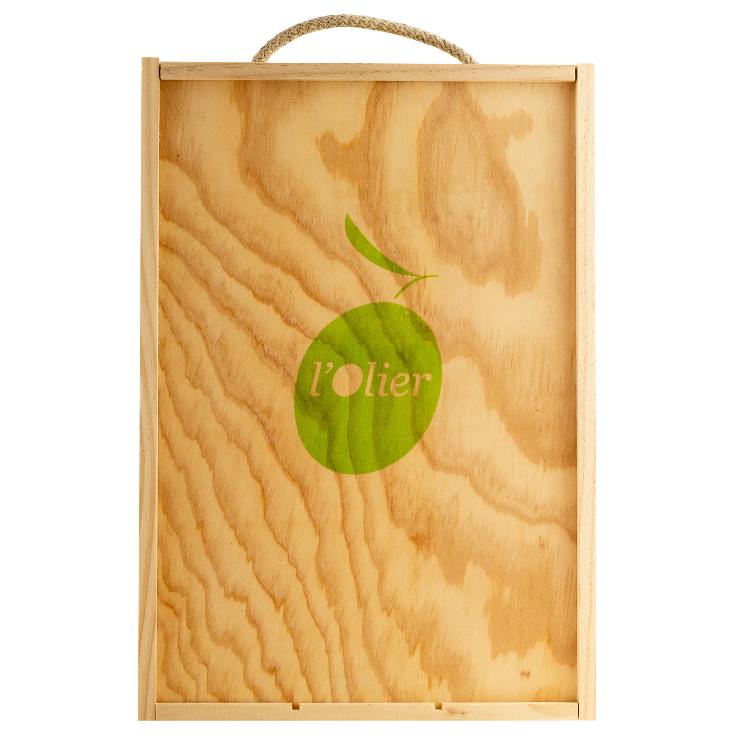 Caixa de fusta de l’Olier, conté: 1 ampolla de 750ml, 1 ampolla de 250ml i una bossa de 500gr d’ametlles salades
